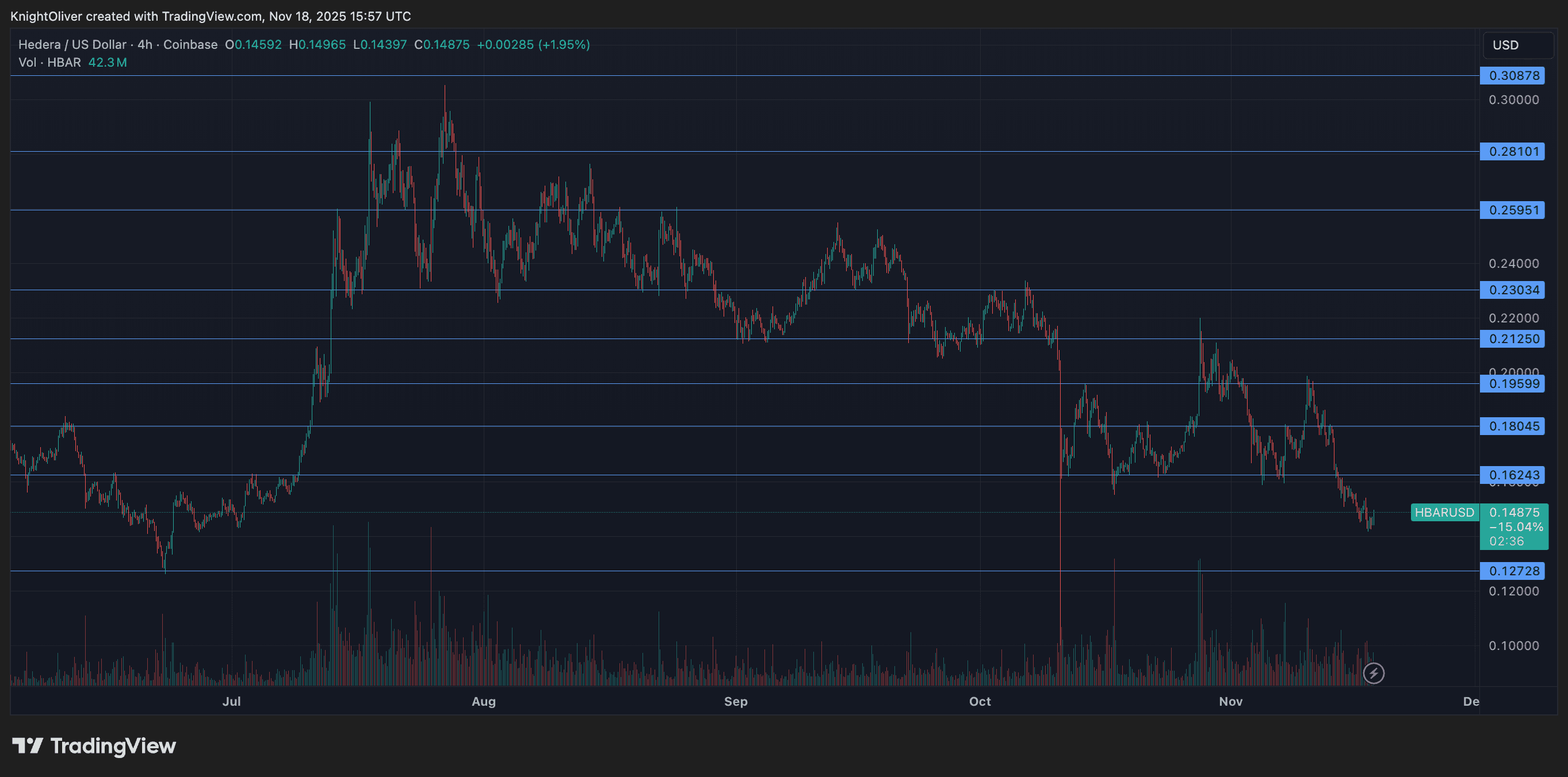 HBAR Drops 6% to $0.144 as Technical Breakdown Accelerates