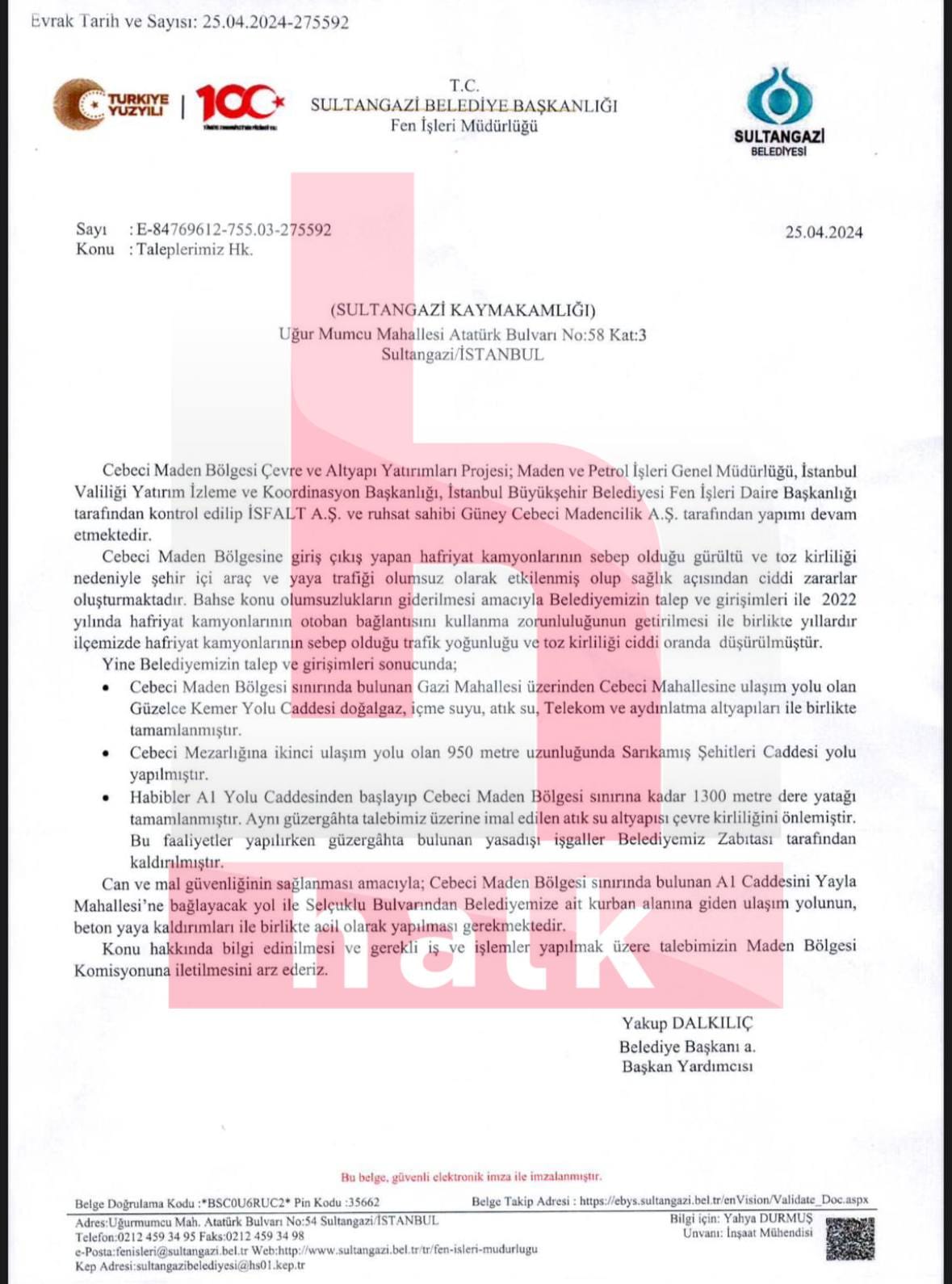 Sultangazi Belediyesi Fen İşleri Müdürlüğü tarafından Sultangazi Kaymakamlığı’na gönderilen E-84769612-755.03-275592 sayılı yazıda, bölgedeki mevcut durum anlatılarak yeni yol talebinde bulunuluyor. Belgede şu ifadeler yer alıyor: