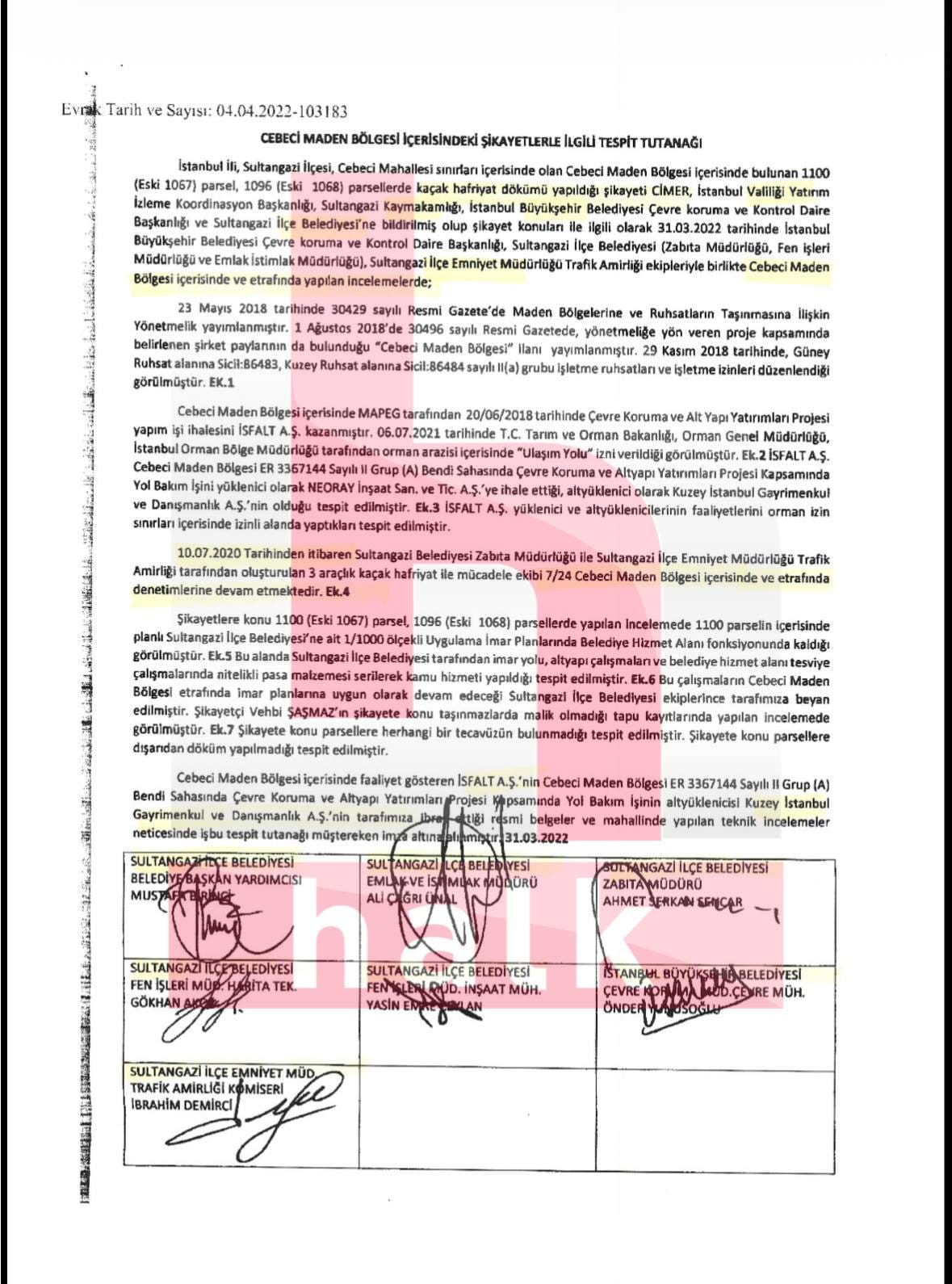 “Yapılan teknik incelemeler neticesinde; dışarıdan kaçak hafriyat dökülmediği ve ilgili firmaların izin sınırları içerisinde faaliyetlerine yasalara uygun olarak devam ettiği tespit edilmiş olup…”