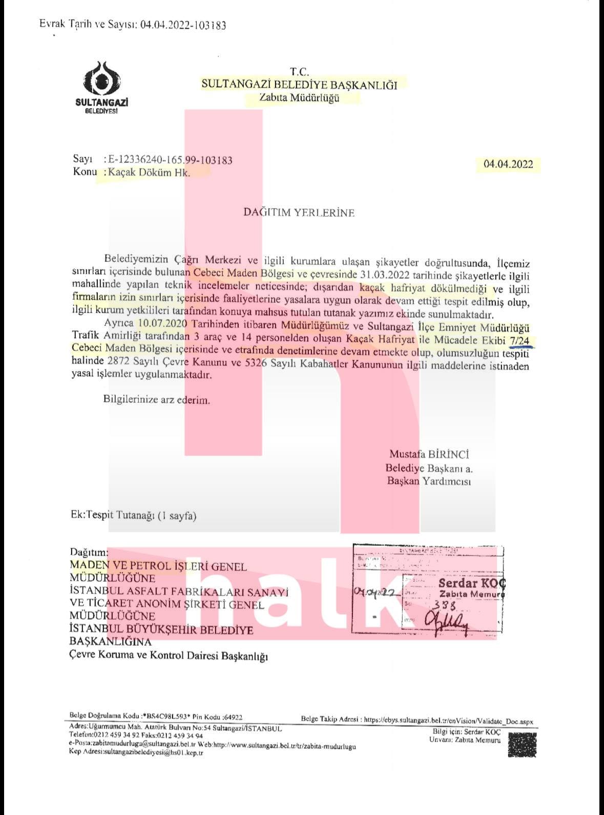 4 Nisan 2022 tarihli, E-12336240-165.99-103183 sayılı ve “Kaçak Döküm Hk.” konulu yazıda, Sultangazi Belediyesi Zabıta Müdürlüğü, bölgedeki şikayetler üzerine inceleme yaptığını belirtiyor. Hem MAPEG’e hem de İBB’ye gönderilen bu yazıda şu tespitler yer alıyor: