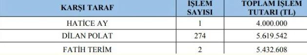 Listede, Dilan Polat’a 5 milyon 619 bin TL, Fatih Terim’e 5 milyon 432 bin 608 TL transfer yapıldığı belirtildi. En yüksek tutarlı transferin ise tanıdıklarına yaptı. Epözdemir bir tanıdığına 117 milyon 780 bin TL aktardığı belirtildi.