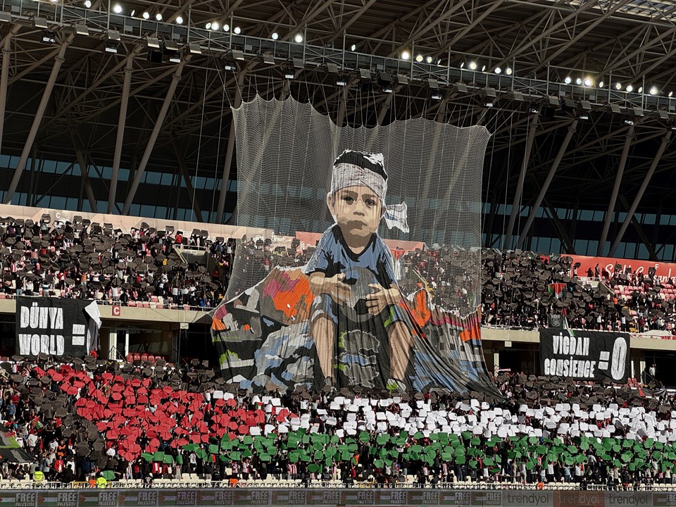 Sivasspor taraftarları, 4 Eylül Stadyumu’ndaki maç öncesi Gazze’de yaşanan insanlık dramına dikkati çekmek için koreografi hazırladı.