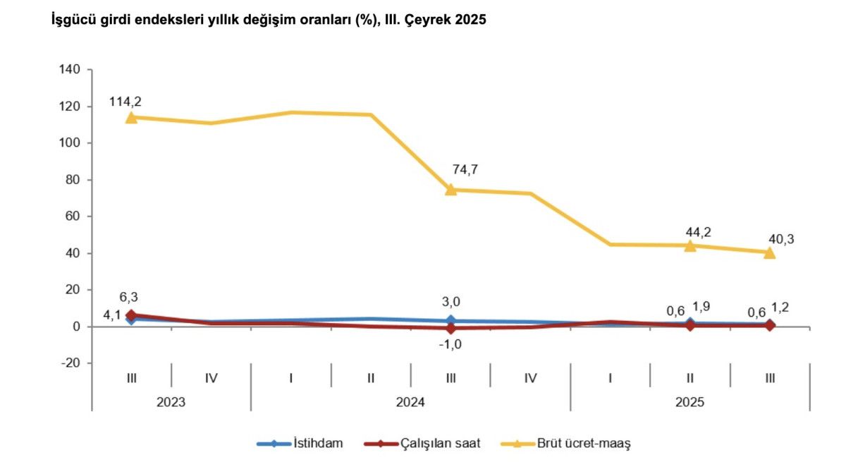 Sanayi, inşaat ve ticaret-hizmet sektörleri toplamında brüt ücret-maaş endeksi, 2025 yılı III. çeyreğinde bir önceki yılın aynı çeyreğine göre yüzde 40,3 arttı. Alt sektörler incelendiğinde, endeks; sanayi sektöründe yüzde 34,5, inşaat sektöründe yüzde 44,4 ve ticaret-hizmet sektörlerinde yüzde 43,5 arttı.